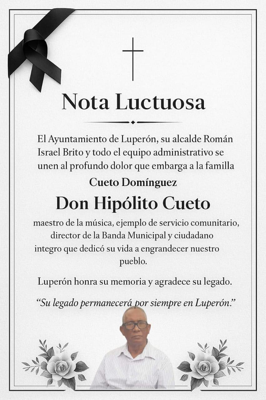 La alcaldía municipal de Luperon ,su alcalde israel brito ,concejo de regidores se une al dolor que embarga a la familia cueto por el fallecimiento hipolito cueto gran maestro de la música del municipio de Luperon donde vivirá en el corazón de todos, su legado vivirá por siempre.