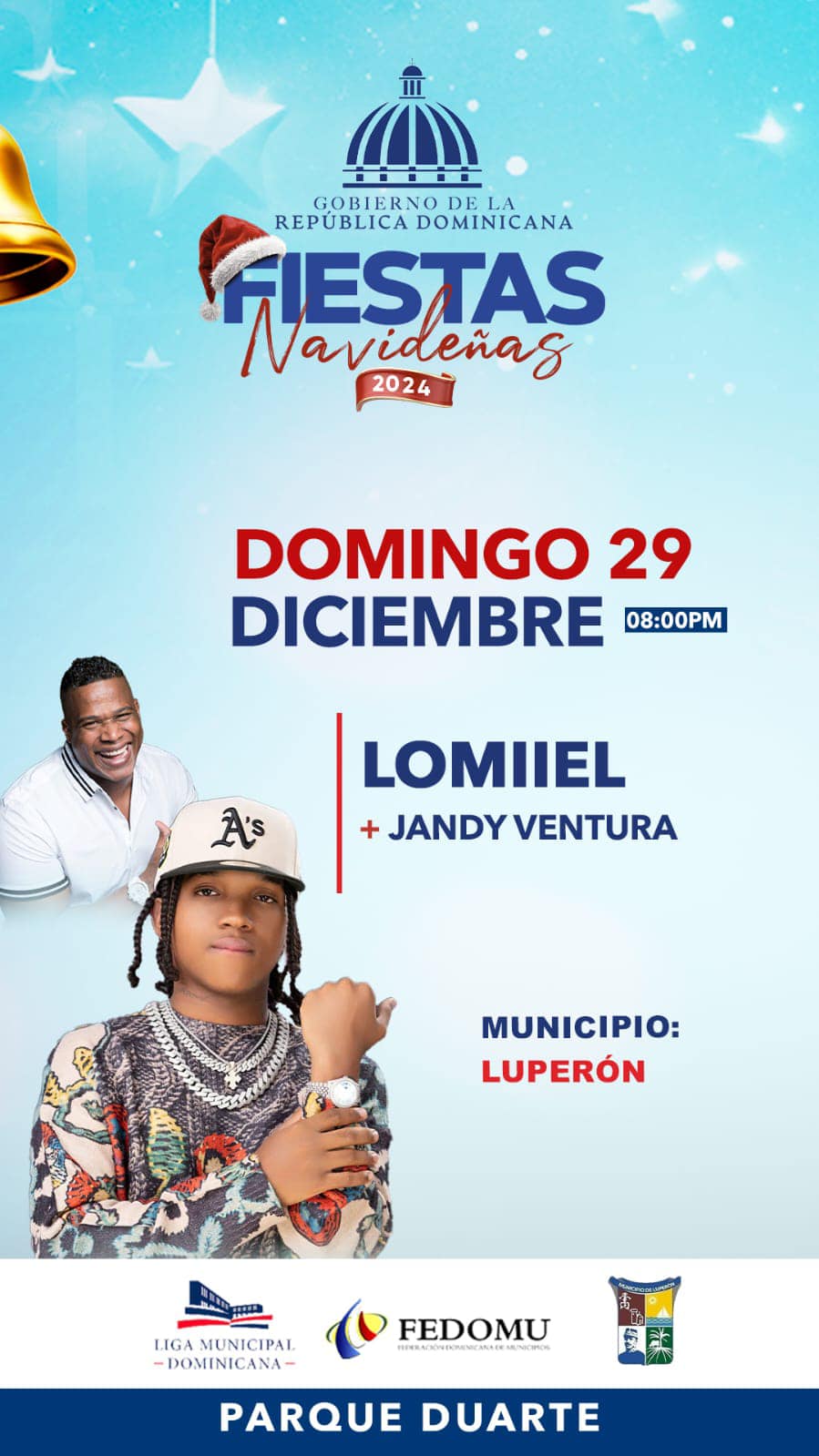 Luperón se viste de gala este Domingo 29 en la plazoleta Duarte , LOMIEL , EL MAS PEGADO ARTISTA URBANO Y Jandy VENTURA el legado , gracias a la Presidencia de la Republica, Luis Abinader Presidente, Alcaldía de Luperón, Israel Brito Alcalde y Fedomu, Liga Municipal Dominicana, te esperamos